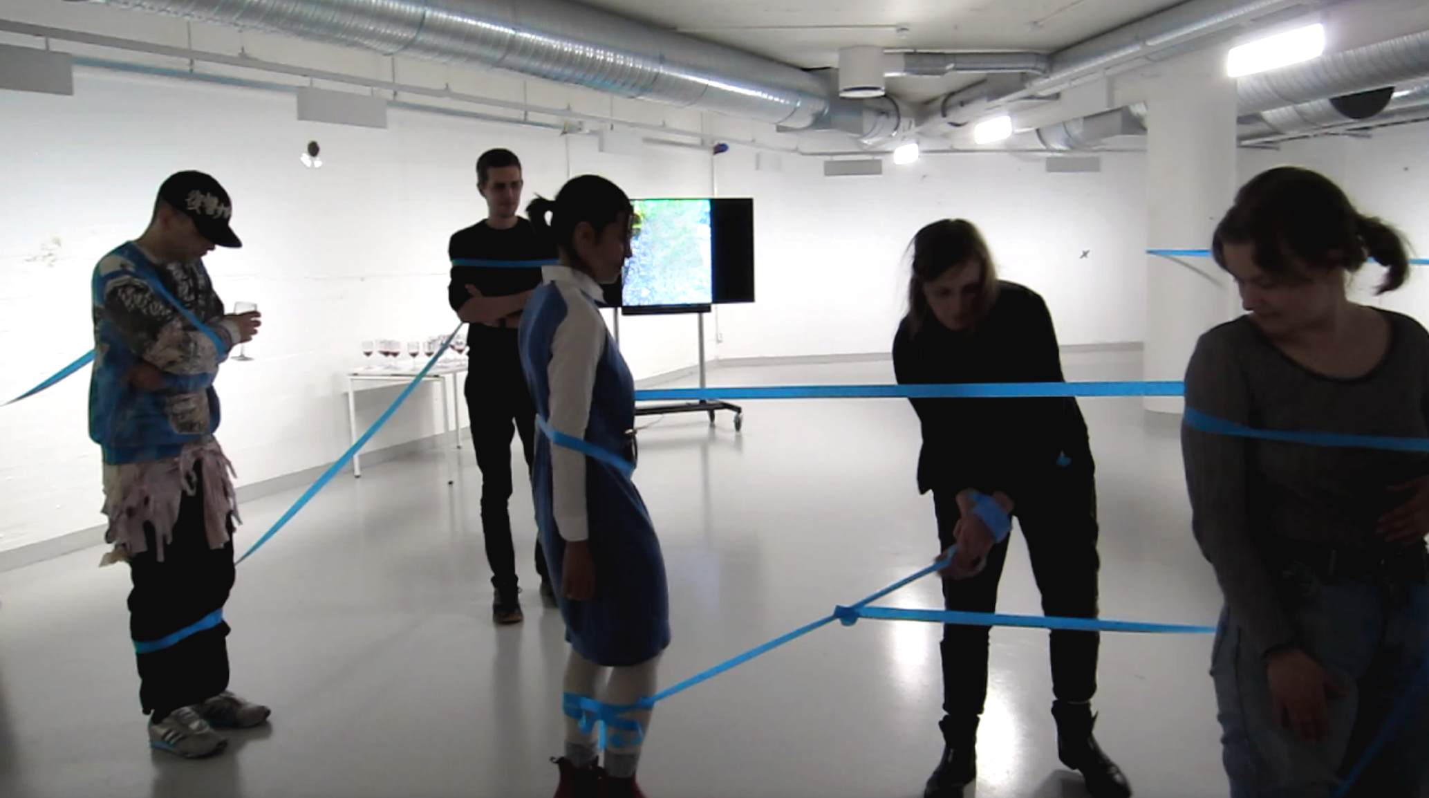 Spatial Control was a performance that connected the audience to the architecture of the space. In this work, the audience was wrapped with tape. The threads that connected each individual created sensory intersubjectivity: any tug or tension on the string created awareness of one’s neighbor. The work constructed a temporary architecture with the audience as material.